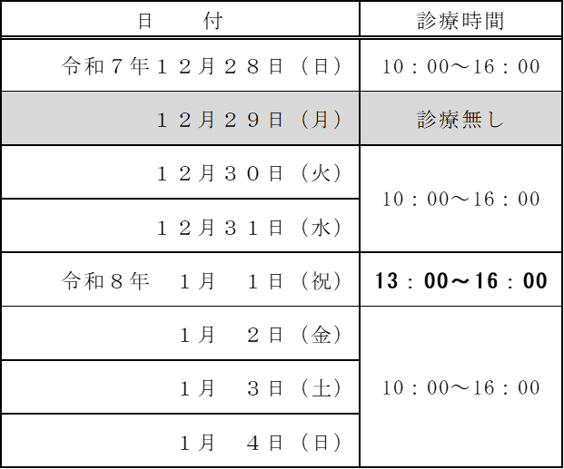 令和7年度年末年始における休日急患歯科診療所の開所日時は下記のとおりです。